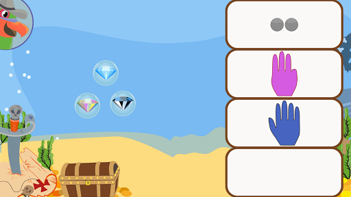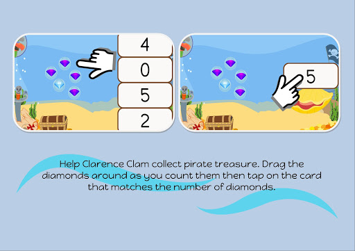 Help Clarence Clam collect pirate treasure. Drag the diamonds around as you count them then tap on the card that matches the number of diamonds.