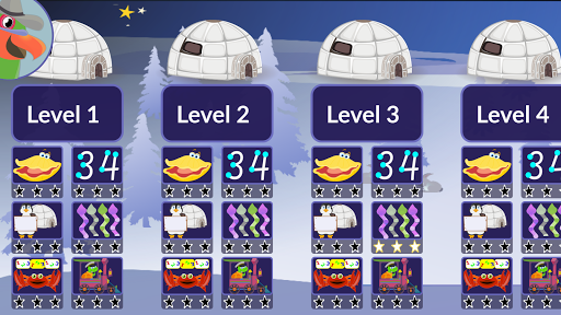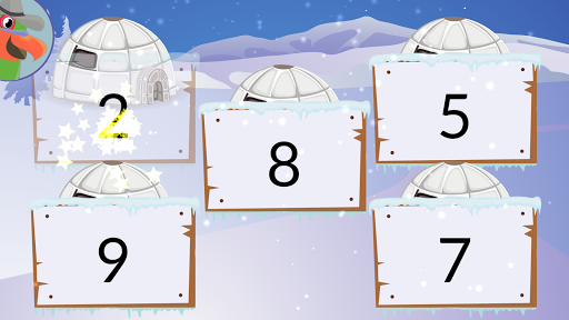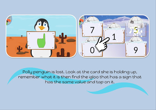 Polly Penguin is lost. Look at the card she is holding up, remember what it is then find the igloo that has a sign that has the same value and tap on it.