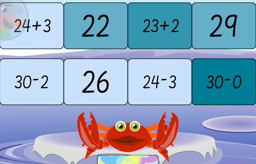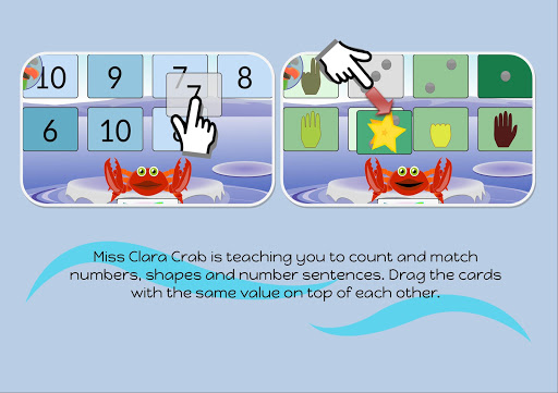 Miss Clara Crab is teaching you to count and match numbers, shapes and number sentences. Drag the cards with the same value on top of each other.