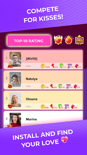 In the Kiss Me app you can chat and meet with foreigners, as well as take part in lots of hilarious competitions. You will have the opportunity to find a woman, a man, a boyfriend or a girlfriend in the relaxed atmosphere of our game. If you want to have a good time and to chat with other people online, it’s exactly what you're looking for. Amazing girls and guys are ready to start a relationship with you!
