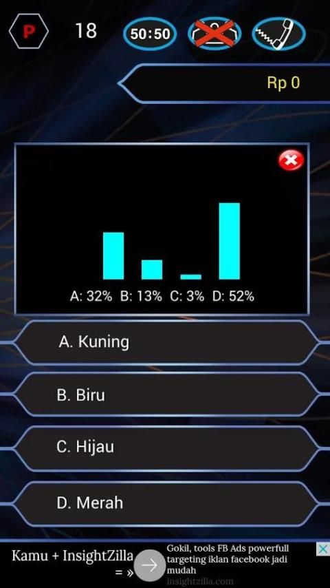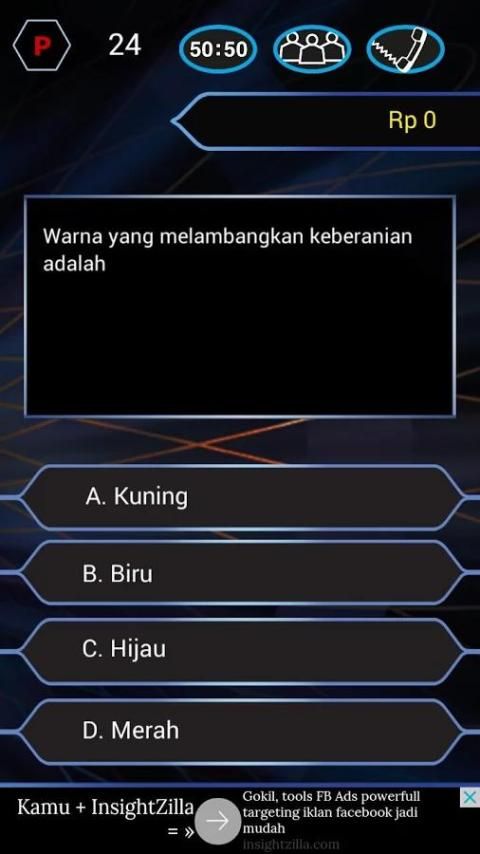 Win 1 billion by answering quiz quiz. There are a total of 15 questions that must be guessed correctly. In addition there are 3 options help, which asked the audience, ask a friend over the phone, and remove two wrong answers.