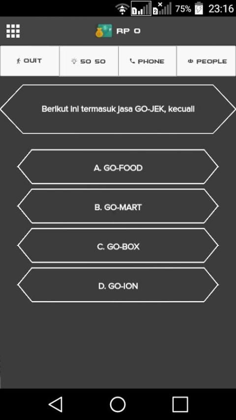 This game is the latest version of quiz games milionaire Indonesia, contains a set of questions to be asked of each level. You will become billionaires and millionaires if successfully answered all the questions. There are 30 questions that you must answer correctly to win this millionaire quiz. The ability of the brain and intelligence you will determine the outcome of this millionaire game.