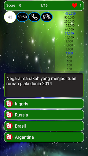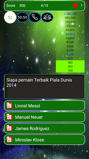 Le jeu de quiz de la Coupe du monde a été fait pour contester la connaissance de la manie de la balle, où les utilisateurs seront posés 15 questions sur le football, en particulier la Coupe du monde.En cas de réponse réussie 15 questions, le niveau suivant est ouvert à jouer. Espérons que ce jeu peut divertir des amateurs de football.