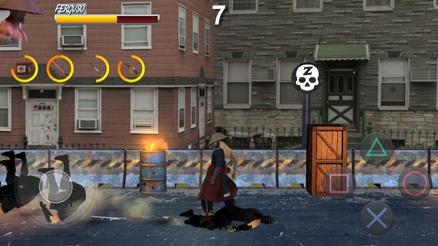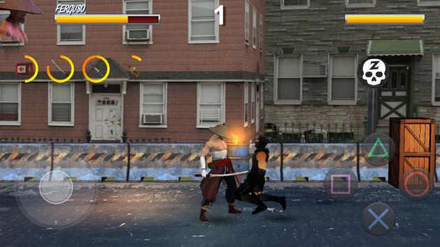 Ferguso and Kyu Thang are a list of characters. Fight with Ninja in Kampoong or Sky-Land. Kampoong and Sky-land is the name of the map. you can use weapon Samurai, Knife and gun.You can use first aid if you can find it.in Kampong you fight on the road next to the office in the city and in Sky-Land you fight on the road next to the Apartment in the city.