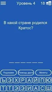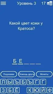 Принцип игры достаточно прост: задаётся вопрос, связанный с играми Год оф Вар. Но это не тест, так что вам не даются варианты ответа. Если вы не можете дать правильный ответ, можно воспользоваться 3 видами подсказок: убрать лишние буквы, открыть букву, открыть всё слово.
