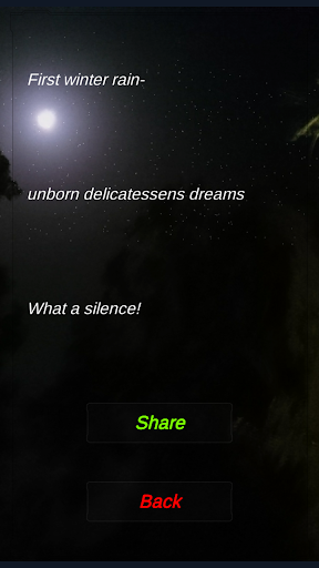 Create your three-line poem like Japanese haiku. Take fun and inspiration! Edit generated text as you like and share it with your friends by any app in your mobile.