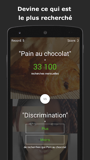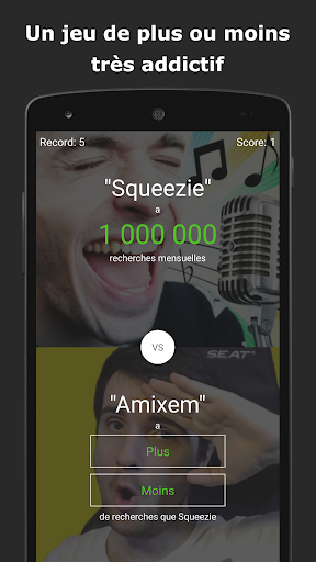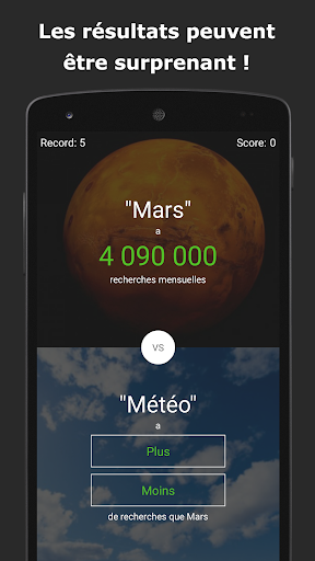 Ce jeu est très simple (et même addictif), il te suffit de choisir quel terme est le plus recherché sur Google. Pour cela il faut sélectionner « Plus » ou « Moins ». Le but est d’enchainer un maximum de bonnes réponses pour décrocher la meilleure place dans le classement.