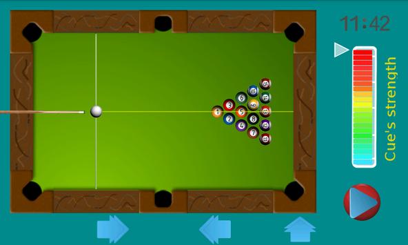 You can adjust the cue by using the blue arrows or touch the screen to adjust the direction of the cue and touch the cue's strength indicator to adjust the strength of the shot before you strike the balls. To strike the balls align the cue with the balls and press the play button, and enjoy the game.