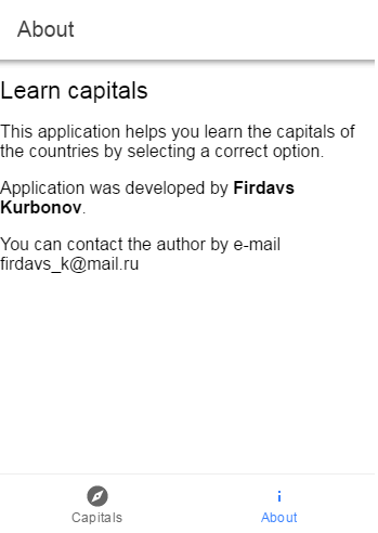 This application helps to learn the capitals of the world countries by providing test questions. You can learn the capitals easily by passing the quizzes.