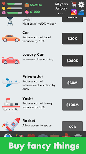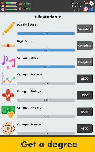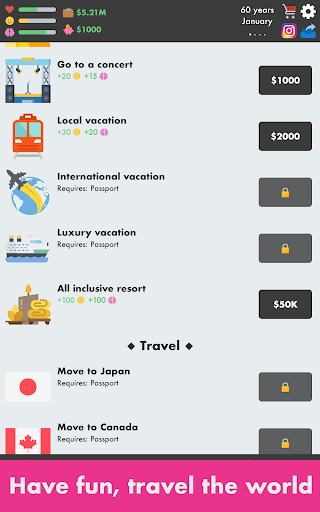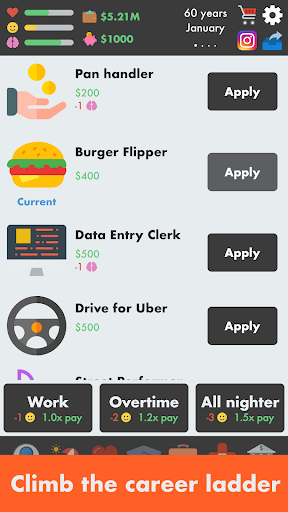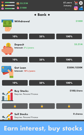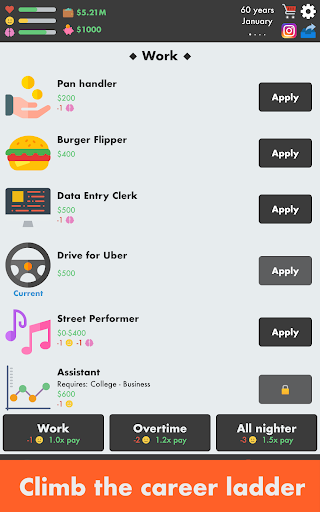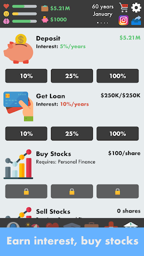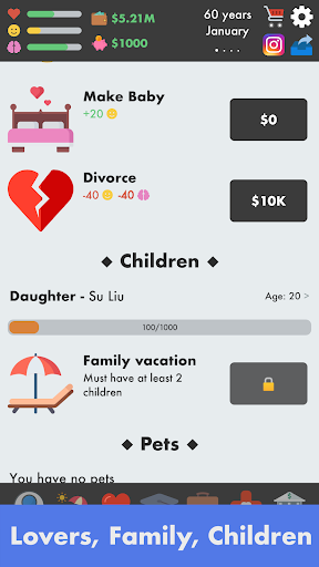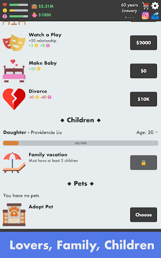 The game contains subtle lessons about financial investment, relationship, career, time management, and life philosophies. Life is a balancing act between health, happiness, mental sanity, and wealth constrained by our limited lifespan, you get to decide how you want to live your life. There are many ways to win!