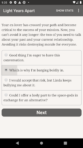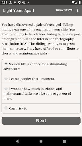 "Light Years Apart" is a 230,000-word interactive sci-fi novel by Anaea Lay, where your choices control the story. It's entirely text-based—without graphics or sound effects—and fueled by the vast, unstoppable power of your imagination.