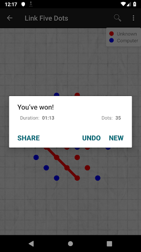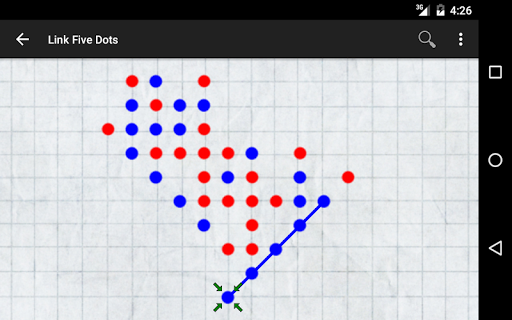Be the first to link five dots in a straight line horizontally, vertically or diagonally. Android plays blue dots, you play red dots. Red and blue dots are put in turn on the line intersections. The first move is yours.