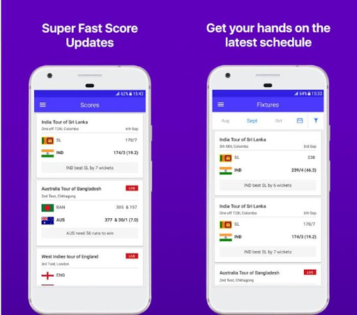 Recent Matches – This app display recent matches with Series Name, Date, Venue and full cricket scorecard updates.