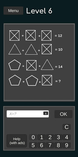 Contains algebraic equations, math riddles and geometric figure quizzes.
