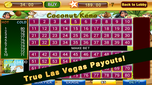 Once you tap on the Play button in the Keno game 10 randomly selected numbers drop on the right hand side. Numbers are highlighted on the Keno card, if any of these dropped keno balls match the number you have selected. The more Keno ball’s numbers match your selection the more you win.