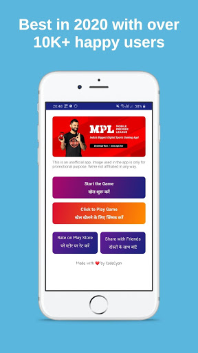 Disclaimer: This is an unofficial MPL game app. This is only a guide / reference app to help you earn money. We're not affiliated in any way to MPL or any other brands. This app is only provided for educational, reference and promotional purpose. Images used are only for promotional purpose. To report any illegal/copyright/trademark use of image or resources please contact us at info@codecyan.com.