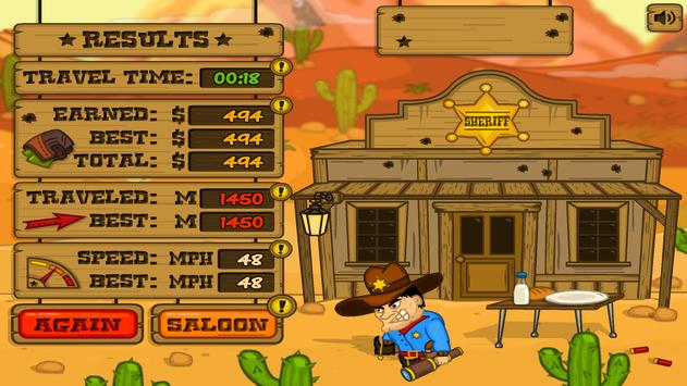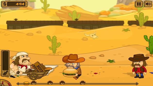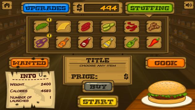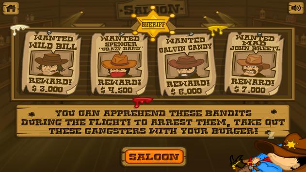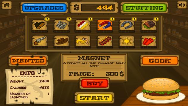 Lost in the vast expanse of the Wild West, your only way to deliver your specialties will be to launch them! To play, use your touch for all actions: prepare your tasty Burgers, trigger the throw, use the sauce "turbo" and use the many bonuses you will collect during the flight. The Saloon is where you will find the improvements: Upgrades and Stuffing. In the Upgrades, you will be able to acquire improvements concerning the throw and in the Stuffing, those of your Burger (additional ingredients). You will have to cook your burger as soon as you have acquired new ingredients. For this, you must first enter the kitchen (Cook menu), cancel your previous Burger (Delete) and finally click on the Cook menu. Before reaching your ultimate goal, ie the Sheriff, enjoy your throwing to apprehend the 4 outlaws who sow terror in the country!