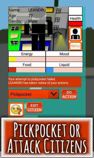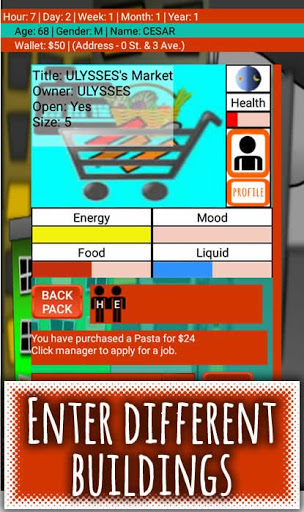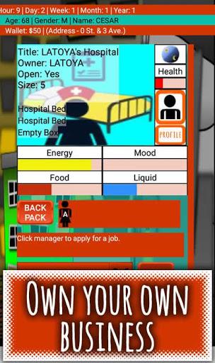 The biggest problem of this era is that we are so caught up in our lives that in this race to achieve everything we forget to get in touch with our own selves. As you play this amazing real life game initially you will face challenges as you will start as a homeless person who is digging through garbage and living in cardboard boxes just surviving one day at a time but you are ambitious and looking for an opportunity to go from zero to hero and become a practical example of rags to riches. As the game proceeds you will face the challenges of choosing a career path as there are 27 different businesses to choose from. You can buy land and build your own empire. You can also expand your business and buy houses of 7 kinds where you can rest and sleep when you get tired. You can also customize you house by painting your bedroom walls. There are many shops and restaurants available which satisfy your needs for eating variety of different food items as well as liquid to quench your thirst on any occasion. These two also saves you from starvation to death and dehydration. Another factor which is also considered in this game is to keep your mood positive and fresh and in order to do that, we are provided with movies to entertain you.
