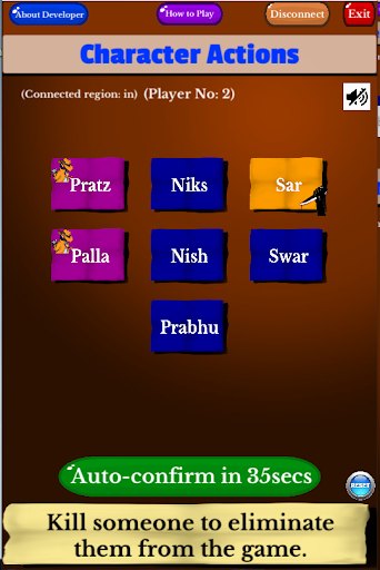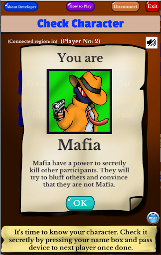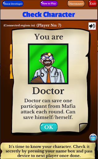 Each character(role) has specific powers except for Villager. Participants who are assigned as Mafia, should bluff, and kill other players on Villagers side intelligently with their acting and convincing skills. While others on Villager's side should try to use their observational skills to find out mafia correctly.