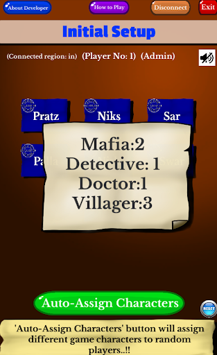 Different characters like Mafia, Detective, Doctor, Villager, etc. are assigned to participants automatically.