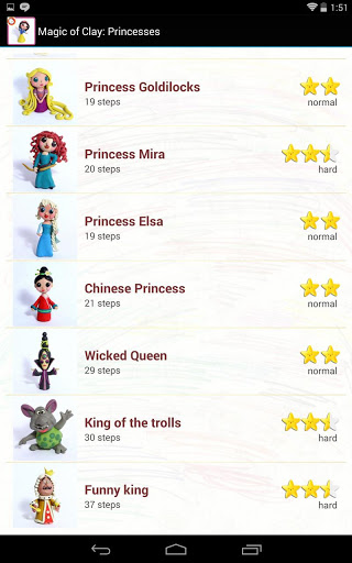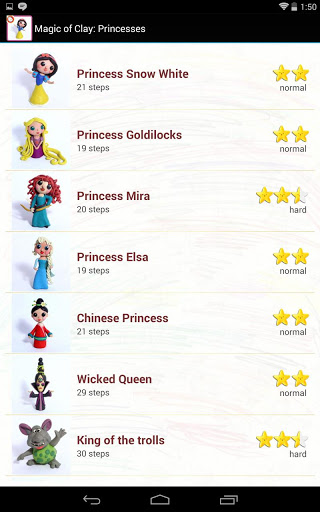 It contains simple step-by-step lessons of clay modeling. Detailed how-to-make illustrations and any child-friendly method of clay modeling will help young creators to realize their ideas and dreams. We show how to sculpt in plastilin or clay charming little princesses, funny kings and even evil queen for your own stories. In this application, there are 10 funny clay characters for your fairyland. (And another 100 models are presented in other editions «Magic of Рlasticine» series). Little novice master learn as they clay, discovering the secrets of plasticine while creating their own toes.