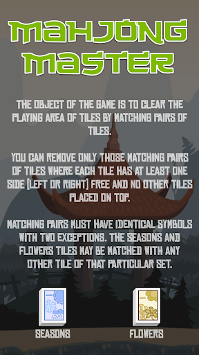 The objective of the Mahjong Master game is to clear the playing area of tiles by matching pairs of tiles. You can remove only those matching pairs of tiles where each tile has at least one side (left or right) free and no other tiles placed on top. Matching pairs must have identical symbols with two exceptions. The seasons and flowers tiles may be matched with any other tile of that particular set.