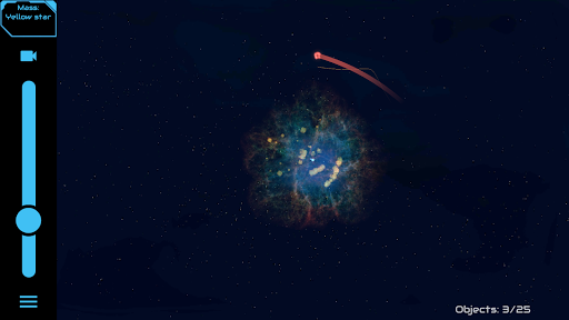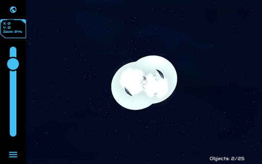 I really like the sandbox. I've had the game over a year and I keep coming back to it. I keep hoping for an update even though it's four years old. It would be cool if you could tap an object in camera mode and see info like: -Gravity -Temperature -Atmosphere -In Goldilocks Zone -If/how long life has established or how many years ago it went extinct An alternative creation method would be nice where you can draw a vector, specify velocity, tap starting location. Please update.