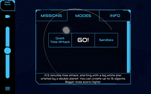 - Time Attack: Your planets will score higher if they have a high mass, but if they are very massive and close, the system will become unstable, and planets crashing or lost into far space will substract points. Will you score higher than your friends?