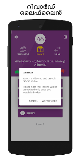 * Once you have completed the two Lifelines, you can use the rewards option if necessary. You have to watch a short video ad for this. After the advertisement, "50-50" lifeline can be used once more. Note that the reward is only allowed if you watch the video fully.
