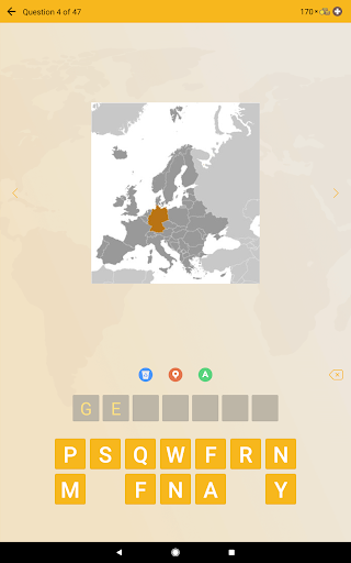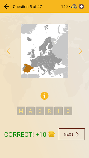 Guess all the countries of Europe, North and South America, Africa, Asia, Australia and Oceania on the contours of maps, learn their capitals, remember their location on the world map, earn coins, and complete the game 100%!