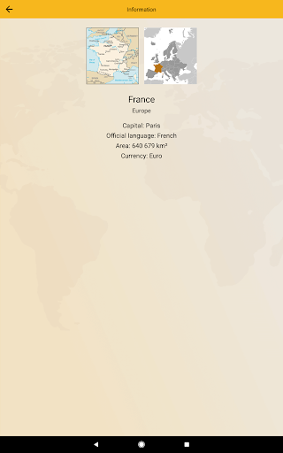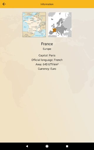 ✓ After you guess the country, you can learn more about it: the capital, the official language, the currency, the area.