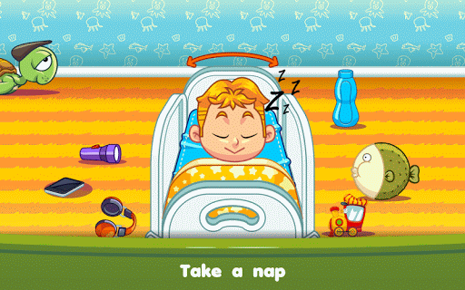 Don't forget to take a nap. Make them a milk when they ask some milk. Shake the bed slowly so that they can sleep well. Oops! your babies wet the bed! it means you need to change the diaper.