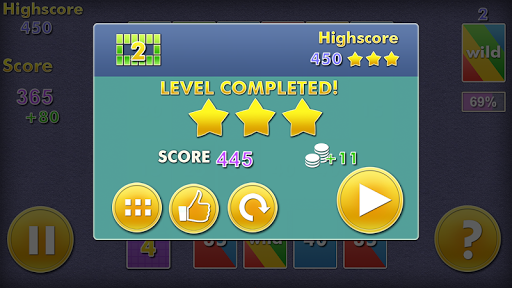 Many levels and three difficulties will not let you to get bored! If you get some stuck - use Wild Card to match with any color!