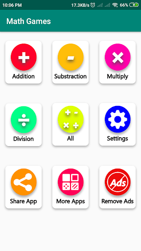 Each category has different play modes to improve math skills - Play, Learn, Quiz, Practice, Duel and Test. Math games can be Educational Learning for kids or brain training app for Adults. Basic and simple Math Game of addition, subtraction, multiplication and division with colorful worksheets. Each set of worksheet shows a score after completion.