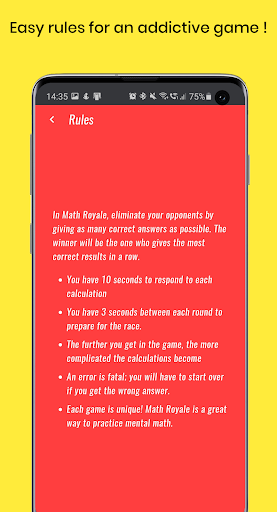 Math Royale is a game of mental arithmetics. Eliminate your opponents by giving as many correct answers as possible, the winner will be the one who gives the most correct results in a row.