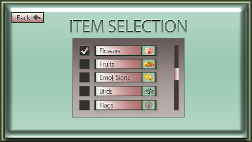 shapes, fruits, birds, plants, flags, emoji signs, vegetables.