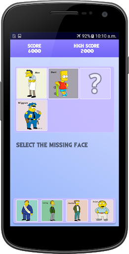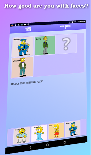 Face activity is a game which shows 2 faces to start with. Then one of the faces is removed. You have to identify if out of the given four options. Number of faces increases as you go to higher levels. All the faces are from Simpsons family.