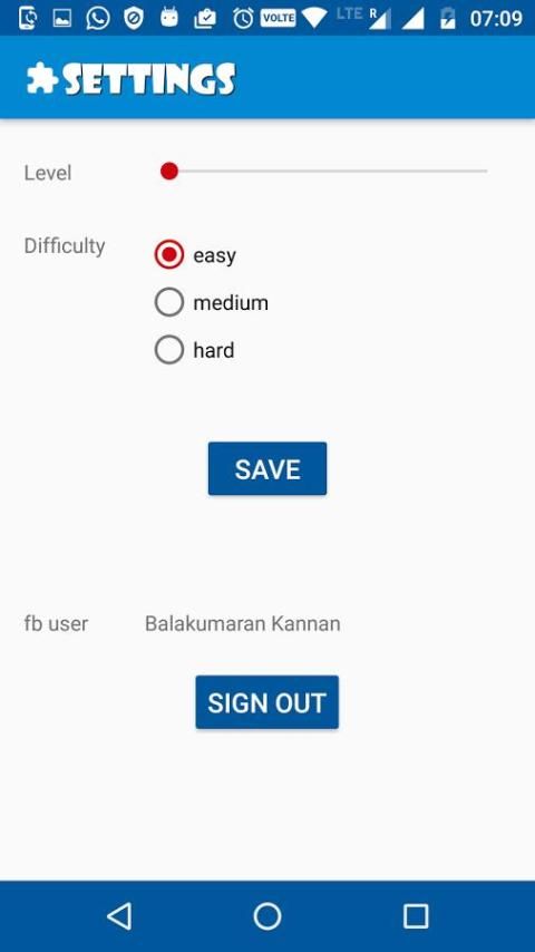 * At any time user can choose the level and difficulty in settings menu;
