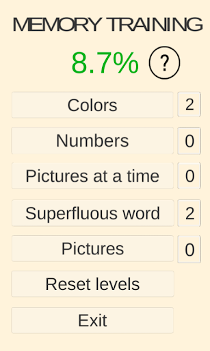 There are five types of memory training in the application. Each species will become more complicated as it passes, due to an increase in the number of elements, a decrease in the time taken to memorize them, and so on.