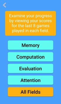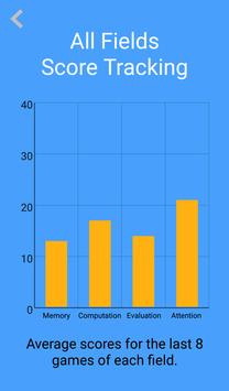 You can keep track of your recent performance in each field by viewing the score-tracking tabs. Your average performance between each field can also be compared, allowing you to see where you are most capable and which field of cognition requires most training.
