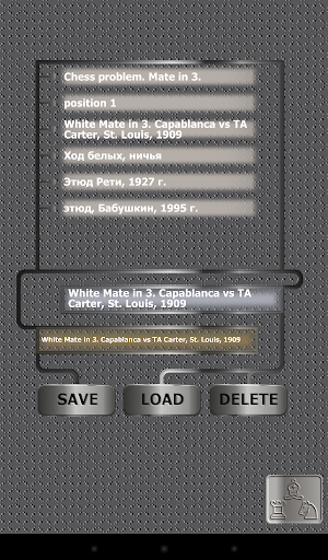 - To save a preset position you can use a special menu. In the input line you can enter an arbitrary name. After saving a new chess position appears in the list, from which you can select to load other previously saved positions.