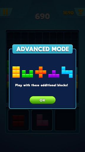 You will be thrilled to see multiple exciting and challenging modes in this modern block puzzle game. You will have simple mode, there will be one time mode in this puzzle game in which timer is running out and you need to clear the blocks on the puzzle board before time runs out and get the puzzle game going on. There will be a blast mode in which multiple bombs with a timer will be placed on the puzzle board and you need to clear the row/column of the puzzle across that bomb before time runs out by placing puzzle pieces wisely in this block puzzle game. And this list goes on.