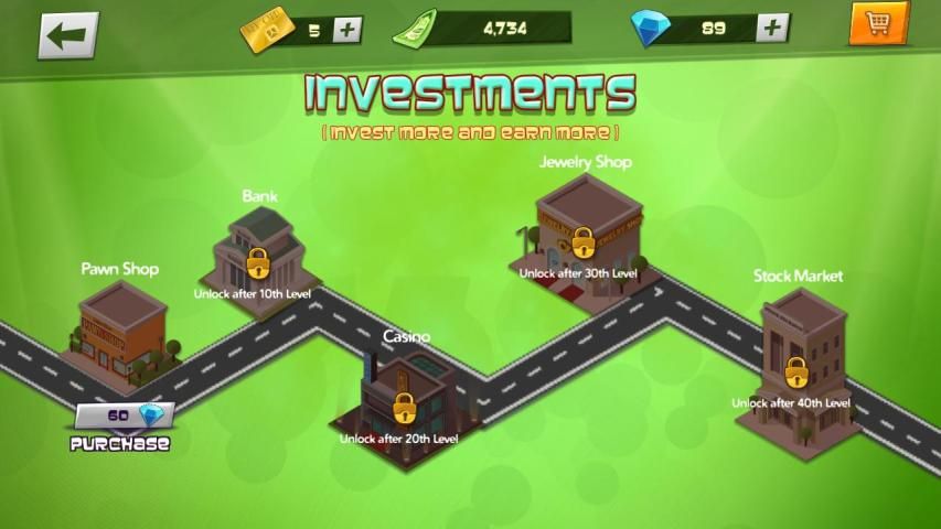 Purchase investments such as Casinos, Jewelry shops, Pawn Shops, Banks and Stockmarket Shares to help climb the rankings on the Money Rules leaderboard. These investments will certainly cash you out in a matter of hours.