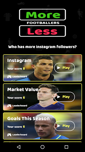 In our game football fans only need to guess More or Less. We devided our game into several categories. Explore each category and Enjoy Football