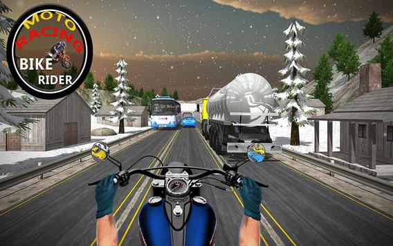 Moto Racing - Bike Rider has fast-paced gameplay and thrilling motobike driving adventures in multiple modes. You as an incredible motobike rider will drive in the village with some treacherous traffic. This racing in moto overtake adventure will let you discover snow environment where you can drive freely by showing stunt actions wearing helmet, just be careful with the hills and other modern classic bikes. Avoid the treacherous dodging cars and trucks, bike riders that come your way, to become the modern motobike racer in this Moto Racing - Bike Rider fast-paced gameplay. Defeat all other modern classic bikes that are designed with best physics in this fast-paced gameplay of 3D simulator. This racing in moto genre adventure will increase adrenaline rush in your body, and that adrenaline rate will be good for your health and you will become unbeatable. Overtake all other crazy vehicles in this incredible racing in moto mania with the best speed in this incredible traffic. Explore incredible motobike racing features in this Moto Racing - Bike Rider 3D simulator by strapping helmet, show some stunt actions by overtake other vehicles to get some rewards and earn money by having the adrenaline rush. Strap your helmet tightly and drive on the incredible adventure of motobike physics genre of fast-paced gameplay. Enjoy incredibly designed motorbikes racing with 3D physics of modern classic bikes. Your bike rider friends may defeat you in this adventure, so be careful from treacherous people and carry on your motobike stunt action adventure with dodging cars and trucks on roads.