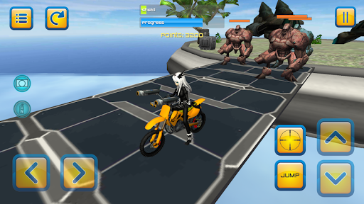Motorbike Jumping Mission is unusual mix between motorbike simulator, arcade shooter and platformer. In this game motorcycle can jump even without stunt ramps. Just use ‘ jump button ‘.