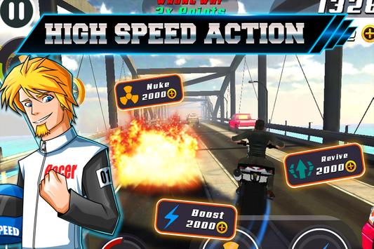 Enjoy the wind in your hair, take your bike to the extreme. This endless bike game will test your skills. Cross lanes, avoid incoming traffic, and do not dent your bike by falling or crashing into on coming traffic. Collect coins to upgrade your bike and receive bonus powerups as you ride the highway and streets.