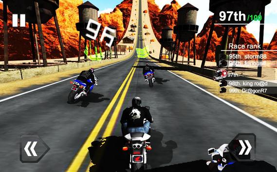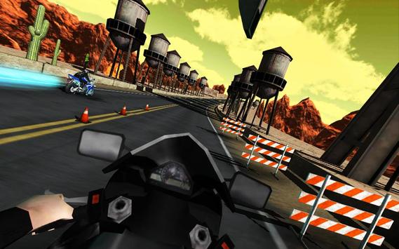 Use all your riding skills in a desert motorcycle race. Accelerate to the maximum and watch out for traffic on the highway. There are 5 motorcycles that can be chosen in this game that involves speed, action and adrenaline. The game is not multiplayer, and the mission is to finish the race first on the podium. There are no in-game purchases and it's totally free. The tracks are in 3d and you can change the clothes of pilot and motorcycles. The game has a size of less than 9mb and takes up little space on your mobile device. We hope you have fun playing motorcycle driving racing.