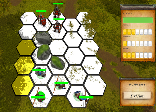 Each character will have different stats such as Hit points, attack range, attack factor, defense factor, movement points, speed, and action points (per turn). This stats will be different depending on the character, for example, a warrior with a shield will have high hit points and defense while a ranger will have a high range, high attack, and low defense & hit points. Current controllable characters: warrior, ranger, horseman, and spear-warrior.