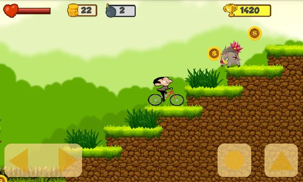 Mr-Bean World: Around the Jungle Adventure you must climb up huge mountains and stairs, fight against perhistoric enemies, avoid falling bricks, find hidden blocks and levels, collect coins and diamonds, explore lot of challenging and addictive jungle worlds and lands and defeat all cruel enemies and bosses.